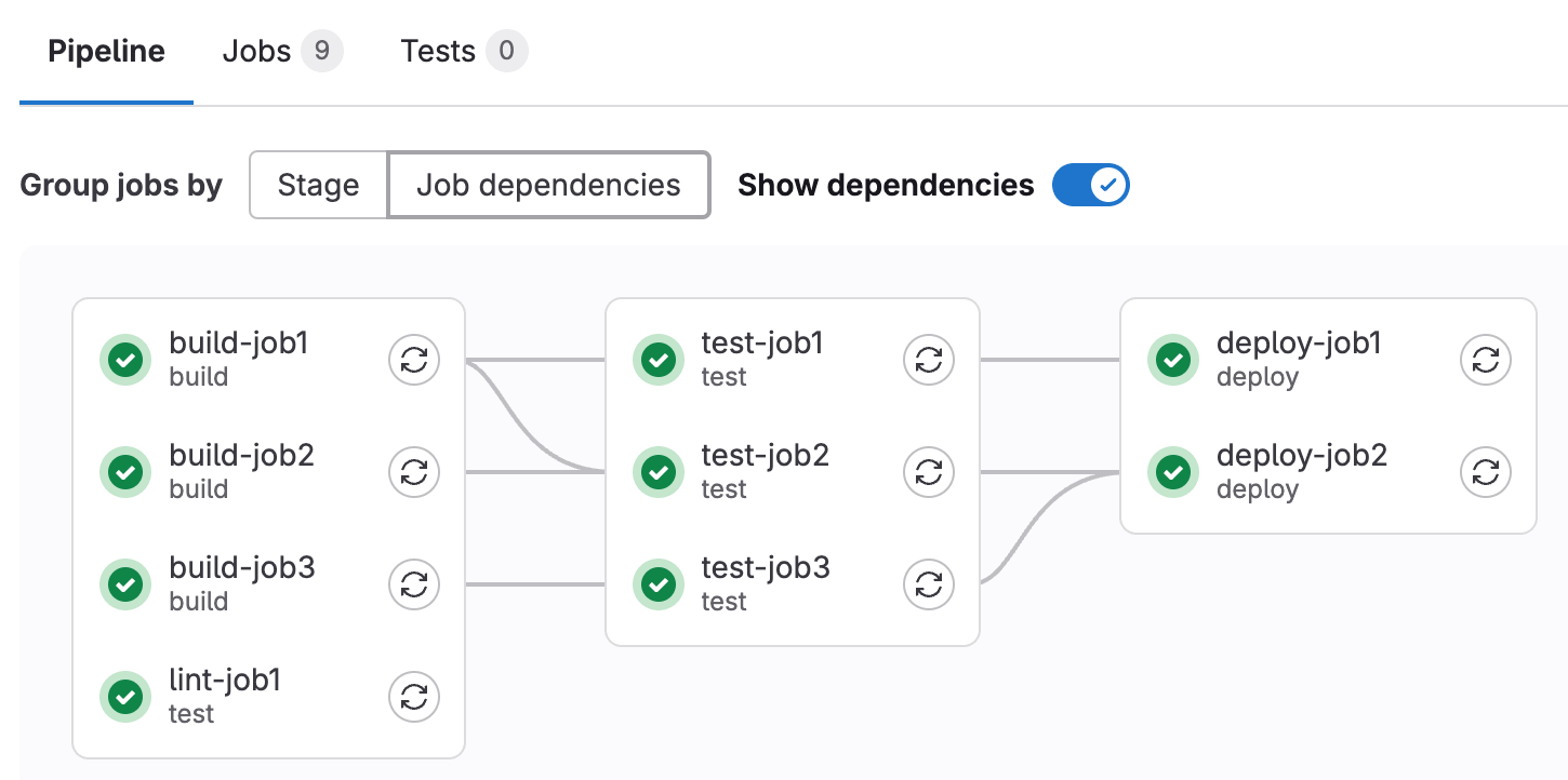 test-job1depends onbuild-job1, andtest-job2depends on bothbuild-job1andbuild-job2, so both test jobs display in the second column. - Both