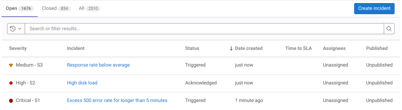 Introduced in GitLab 13.3: incidents are sorted by created date by default.