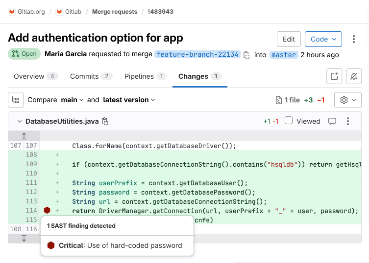 GitLab SAST uses an advanced vulnerability tracking algorithm to more accurately identify when the same vulnerability has moved within a file due to refactoring or unrelated changes.